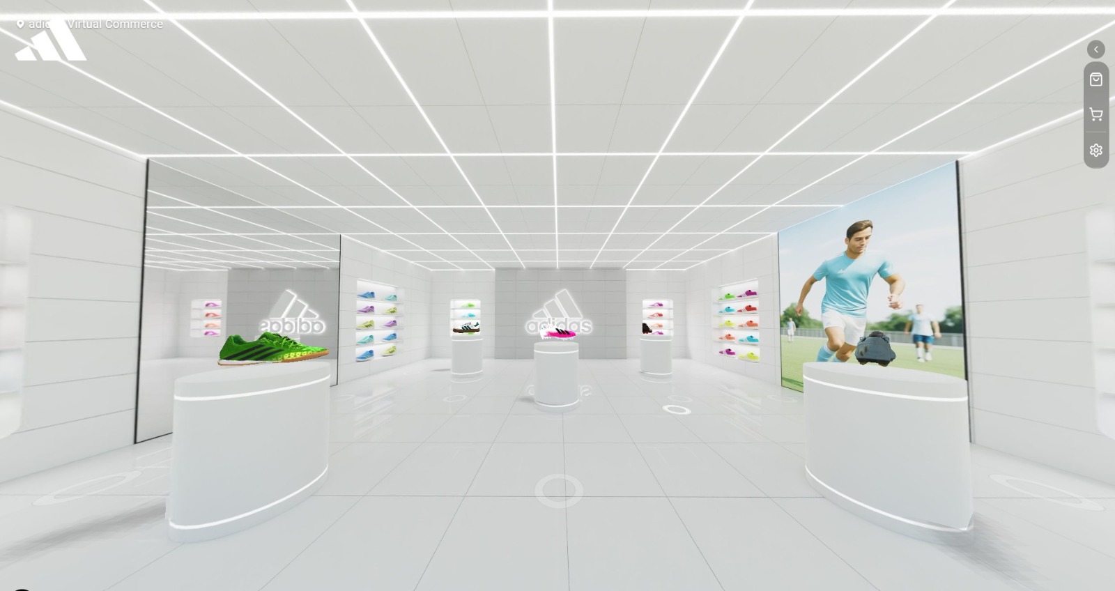 The adidas V-Commerce virtual tour recreates the store in an immersive 3D experience, letting users explore products, interact with hotspots, and discover the brand from anywhere.